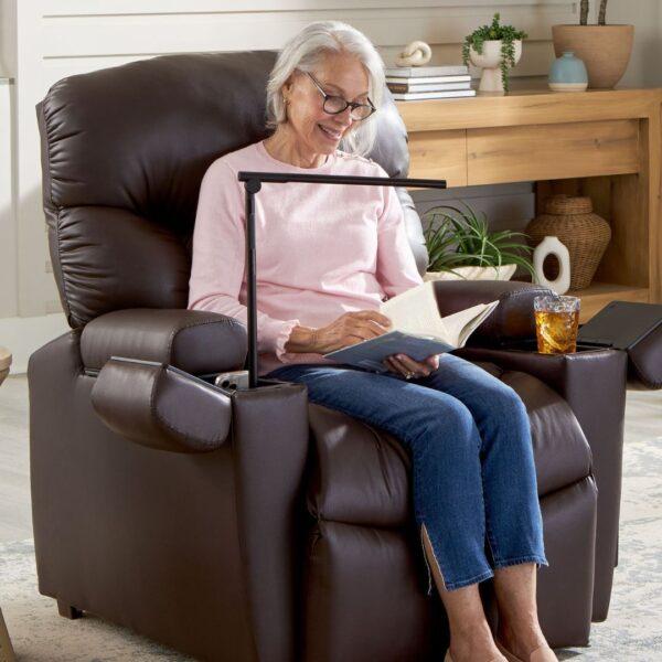 The right arm compartments house a hand control dock, wireless phone charger, and power port compatible with the included LED reading light and butler tray. On the left, you’ll find a build-in drink holder, USB port, and extra storage space.