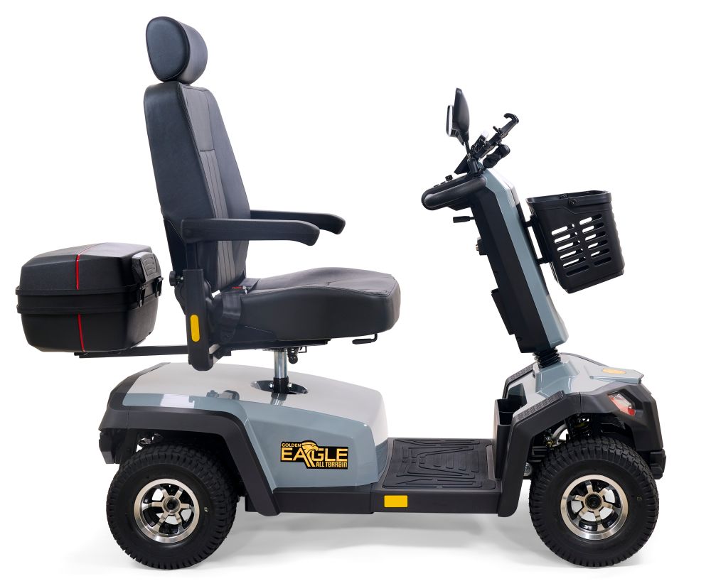 Take your outdoor driving experience to new heights with the Golden Eagle All-Terrain™ scooter. In a class all its own, the Eagle AT's stylish yet rugged, off-road design is built for superior performance and maneuverability with front and rear adjustable suspension for smoothly traversing outdoor terrain and a powerful 200 Amp controller for outstanding climbing ability. It offers full LED lighting with brake light and turn signals, an infinitely adjustable wraparound tiller, and a reclining, high-back captain's seat for maximum comfort, plus durable vibrant red or grey color shrouds for a sporty look. With a 500 lb. weight capacity, 13”" pneumatic turf tread tires, up to 34-mile operating range on 75 AH batteries, plus a water-resistant rear carry case for personal items, the Golden Eagle AT offers everything you need to enjoy your next adventure!