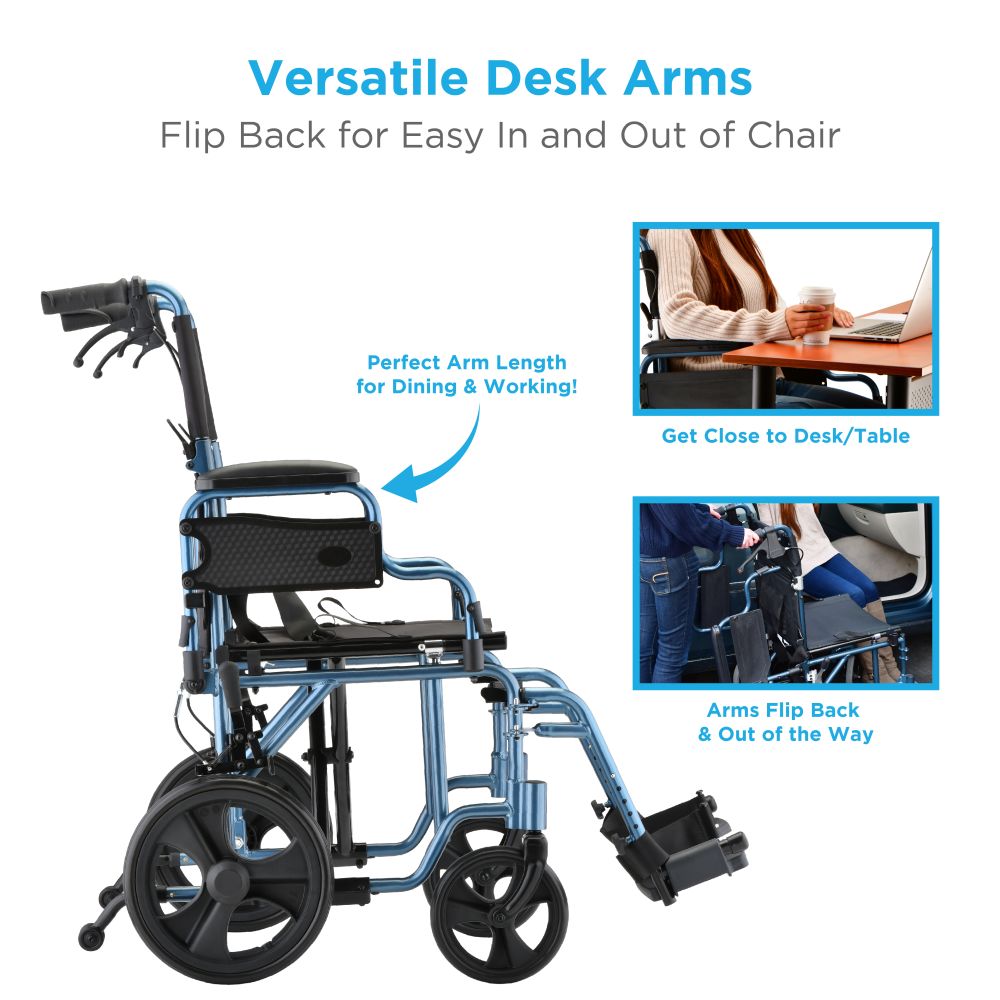 The Lightweight Transport Chair 19 in. has a lightweight aluminum frame and padded upholstery. It has a quick release fold-down back, as well as padded, detachable/reversible desk arms for added convenience. This transport chair has locking rear wheels, as well as hand brakes for added safety and control.